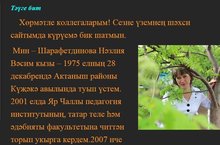 "Ел укытучысы -2015" бәйгесенең мәктәп этабында татар теле һәм әдәбияты укытучысы Шарафетдинова Нәзлия Вәсим кызы җиңеп чыкты. Ул үзенең эшчәнлеген шәхси сатйныда яктырта http://tugantatar.jimdo.com/