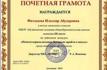 В райооном конкурсе "Помоги первокласснику безопасно прийти в школу" в номинаөии фотоотчет учителҗ началҗных классов Фазлиева И.А. заняла 3 место.