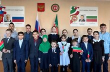 Яшел төс — тормыш, яшәеш, яңарыш, Ислам дине төсе. Ак төс — пакьлык билгесе, кызыл төс — яшәеш, сәламәтлек, энергия, көч-куәт төсе.День флага Республики Татарстан ежегодно отмечается 29 ноября. В этот день в 1991 году Верховный Совет РТ утвердил государственный флаг Республики. Это событие имеет глубокое значение для всех татарстанцев и символизирует единство, патриотизм и гордость за нашу Родину. В честь этого события в нашей школе было проведено общешкольное мероприятие. Автор государственного флага Татарстана — народный художник РТ, лауреат премии Г. Тукая Тавиль Хазиахметов. Государственный флаг Республики Татарстан представляет собой триколор, состоящий из горизонтальных полос зеленого, белого и красного цветов. Белая полоса посередине, составляющая 1/15 ширины флага, зеленая полоса вверху. Зеленые и красные полосы одинаковы по размеру. Отношение ширины флага к его длине — 1:2. Зеленый цвет — цвет жизни, возрождения, ислама. Белый цвет-символ чистоты, красный-жизни, здоровья, энергии, силы.