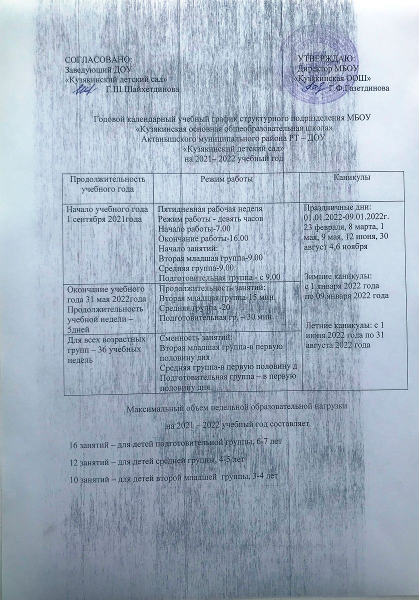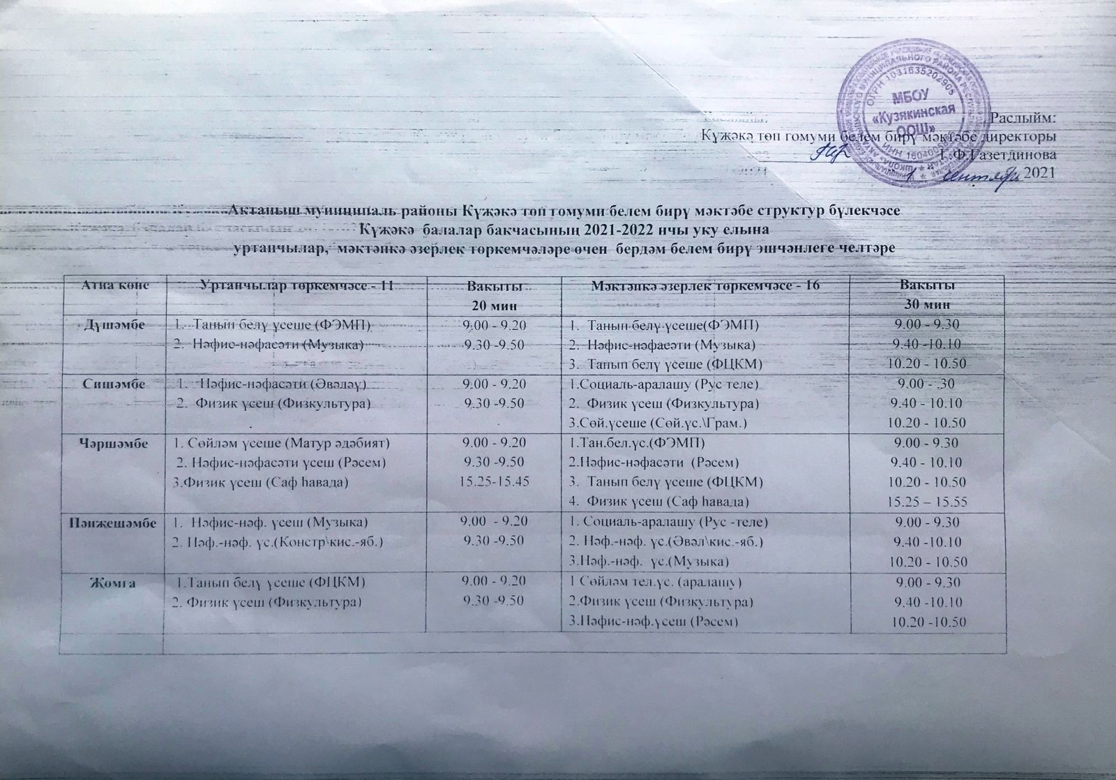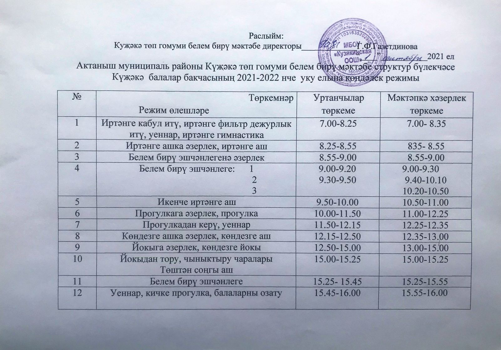 2021-2022 нче уку елына көндәлек режим