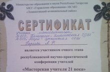 Учитель математики Гараева А.Ф. участвовала в очном этапе республиканской научно-практической конференции учителей "Мастерская учителя 21 века" с проектной работой "Воспитание толерантности и чувства гордости к своим соотечественникам на уроках математики путем изучения вклада в науку Татарстана математиков разных национальностей (презентация опыта работы)"