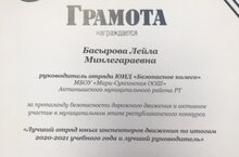 Басыйрова Лейла Минлегараевна, руководитель отряда ЮИД «Безопасное колесо», награждается грамотой за пропаганду безопасности дорожного движения и активное участие в муниципальном этапе республиканского конкурса «Лучший отряд юных инспекторов движения по итогам 2020-2021 учебного года и лучший руководитель»