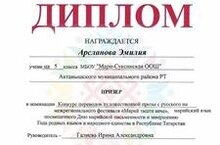 Арсланова Эмилия,ученица 5 класса,стала призером межрегионального фестиваля "Марий тиште кече " в номинации "Конкурс переводов художественной прозы с русского на марийский язык",посвященного Дню марийской письменности и завершению Года родных языков и народного единства в Республике Татарстан