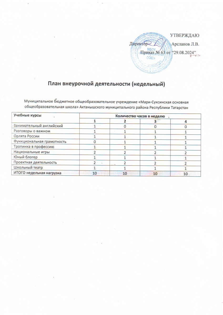 План внеурочной деятельности на уровень начального общего образования на 2024-2025 уч. год