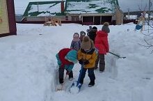 Воспитанники ДОУ "Минняровского детского сада", находясь днем на свежем воздухе, успевают поиграть и помогать воспитателям в уборке снега.