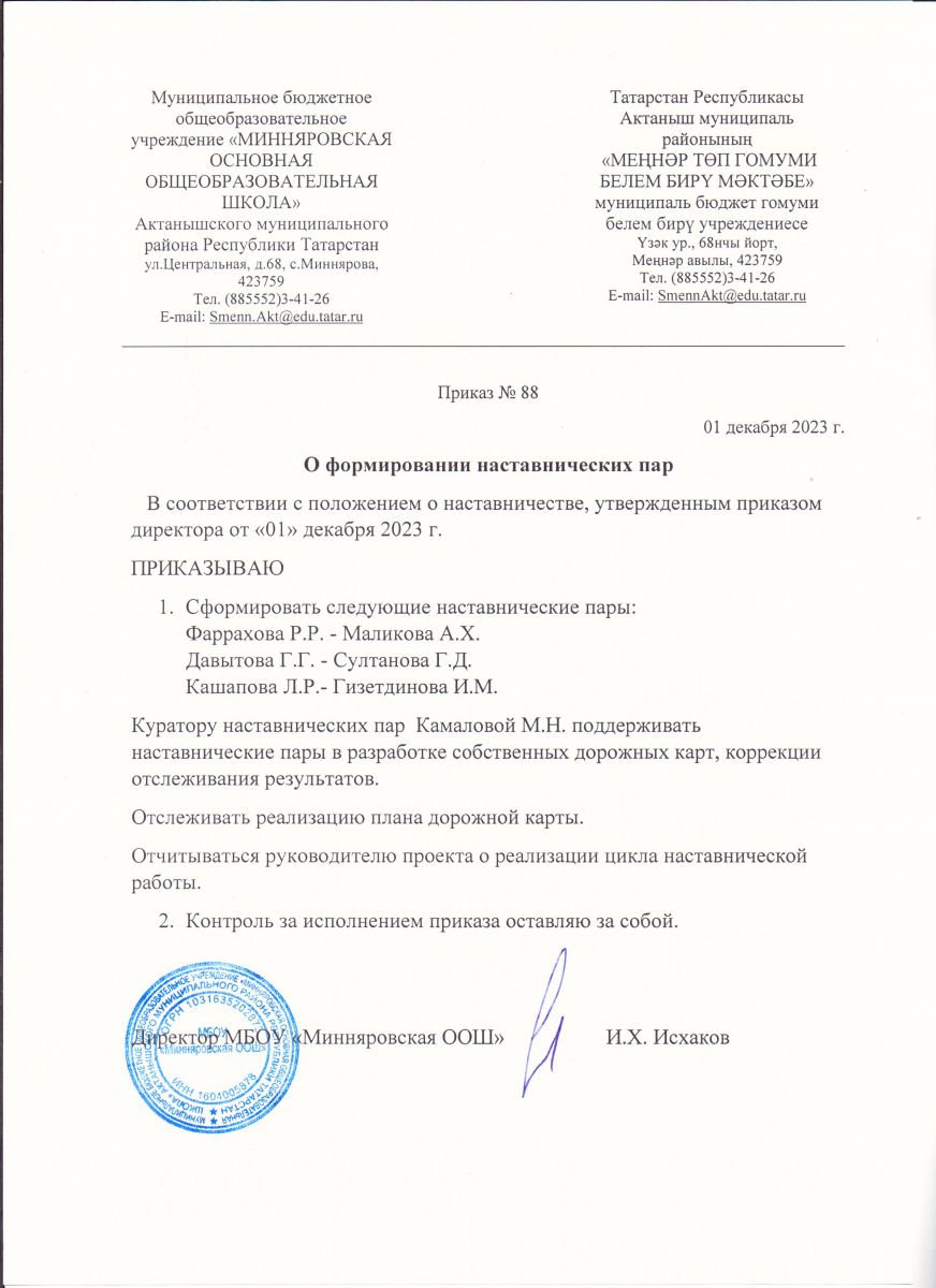 Приказ о создании наставнических пар в МБОУ "Минняровская ООШ"