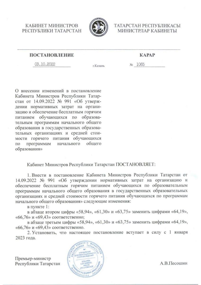 Постановление КМ РТ о внесении изменений 1065 от 03.10.2022