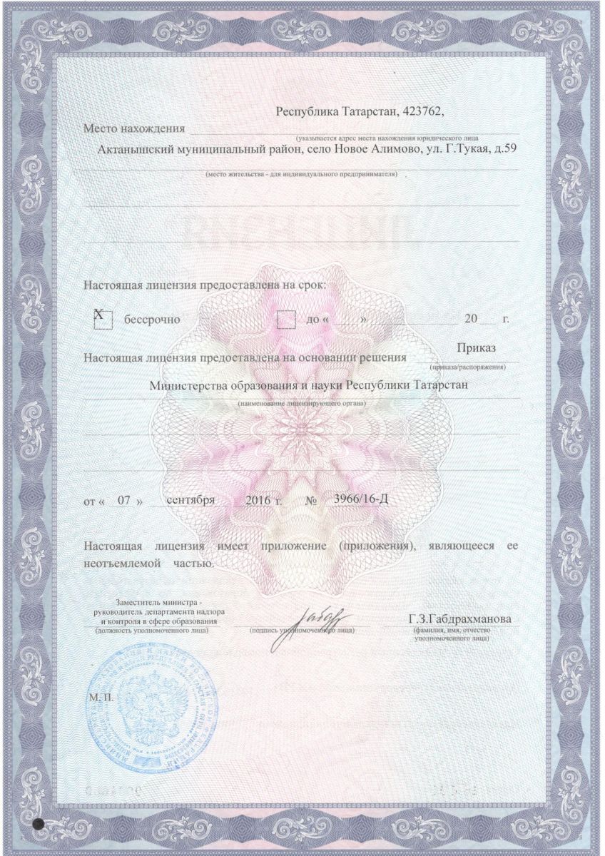 | Адрес: | 423762, Республика Татарстан, Актанышский район, с. Новое Алимово, ул. Г.Тукая, д. 59 |