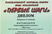26 январь көнне Чаллы шәһәрендә яшь башкаручыларның "Беренче адымнар" республика фестиваль-конкурсында биючеләребез бик уңышлы чыгыш ясадылар."Шатлык" бию ансамбле ике номинациядә катнашып, 1 нче дәрәҗә, 3 нче дәрәҗә лауреат, "Алмалары-чияләре" ансамбле 1 нче дәрәҗә лауреат булдылар. Ялгыз биючеләребез Шайхеразиева Айзилә, Хәбибуллина Риана 1 нче дәрәҗә, Вагизова Карина, Шәрипова Ясминә 2 нче дәрәҗә лауреат, Хәбибуллина Зәлия, Аглямов Айнур 3 нче дәрәҗә лауреатлар. Парлы биючеләр Саетов Әмир, Шәрипова Ясминә 1 нче дәрәҗә лауреат, Зәкиев Раяз, Нургалиева Азалия 3 нче дәрәҗә лауреатлар! Укытучылары Айзирәк Локманова, Гөлнара Зайцева, Ленара Шәрипова. КОТЛЫЙБЫЗ!