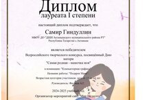 Балалар сәнгать мәктәбе үз лауреатларын сәламли! Менә алар-безнең I дәрәҗә лауреатлар - Валерия Сәлахова,Гөльяз Хангирова,Зарина Абүдарова,Инеля Самерханова, Лиана Сафина, Самир Гиндуллин.???? Әниләр көненә багышланган "Самая родная - мамочка моя" бөтенроссия иҗат конкурсында катнашучыларны укытучы Алмаз Гафият улы Фазлыев әзерләде. Укучылар үз эшләрен "Компьютер графикасы" номинациясендә тәкъдим иттеләр. Котлыйбыз!