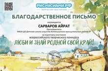 Рәсем бүлеге укучылары Галимуллина Язиля, Шәмсиева Ильнара, Камалетдинова Зөһрә "Люби и знай свой край родной" бөтенрәсәй иҗат конкурсында катнашып, 1 нче дәрәҗә лауреатлар булдылар. Укытучылары Айрат Сарваров. КОТЛЫЙБЫЗ!