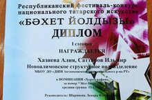 13 ноябрь көнне Чаллы шәһәрендә үткәрелгән "Бәхет йолдызы" милли татар сәнгате республика фестиваль - конкурсында катнашып, бию бүлеге укучысы Хаҗиева Алия (ялгыз бию) 1 нче дәрәҗә лауреат, Саттаров Ильмир, Хаҗиева Алия (парлы бию) 1 нче дәрәҗә лауреат дипломнары белән бүләкләнделәр. Җитәкчеләре Ленара Шәрипова. КОТЛЫЙБЫЗ!