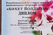 "Бәхет йолдызы" милли татар сәнгате республика фестиваль-конкурсында катнашып, вокал бүлеге укучысы Шәрипова Мәрьям 2 нче дәрәҗә диплом белән бүләкләнде. Җитәкчесе Джон Мусин. КОТЛЫЙБЫЗ!