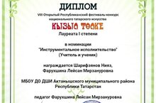 ДИПЛОМОМ ЛАУРЕАТА І СТЕПЕНИ VIII Открытого Республиканского фестиваля-конкурса национального татарского искусства «КЫЗЫЛ ТӨЛКЕ»в номинации"Инструментальное исполнительство"(Учитель и ученик)