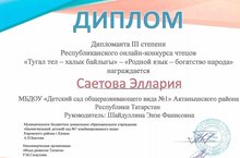 Республика күләмендә уздырылган "Туган тел-халык байлыгы" бәйгесендә катнашып, Саетова Эллария 3 нче урынга лаек булды. Афәрин!