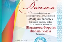В IV республиканском конкурсе чтецов "Моң кайтавазы" имени Эльвиры Ибрагимовой, активное участие приняли и дети, и педагоги нашего детского сада. Фардиева Милана заняла 3 место, Габдрахманова Алия 1 место, Миляуша Загирзяновна 3 место. Фарсия Фагимовна была награждена дипломом как подготовительница лучших чтецов Поздравляем победителей! Желаем успехов.