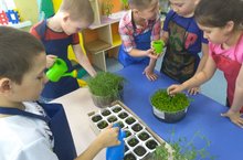Балаларны язгы үзгәрешләр белән таныштыруны дәвам итәбез. Тәрәзә төбендә тәҗриҗрибә ясау, күзәтү максатыннан мәктәпкә әзерле Б төркемендә йөрүче балалар кечкенә савытларга бодай, борчак, арыш чәчтеләр, суган утырттылар. Балалар үзләре су сибә. Көн дә килү белән үсентеләрне күзәтәләр. Үтәкүренмәле савытта үсентеләрнең тамырлары да күренә. Суган кыяклары озын булып үскәч, көндезге ашны балалар тәмле яшел суган белән ашады. Тал песиен балалар аеруча яратып күзәтә.