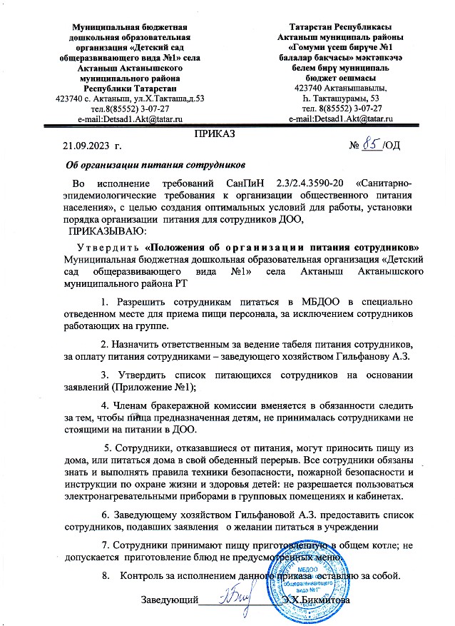 Приказ "Об организации питания сотрудников" №85 от 21.09.2023 г.