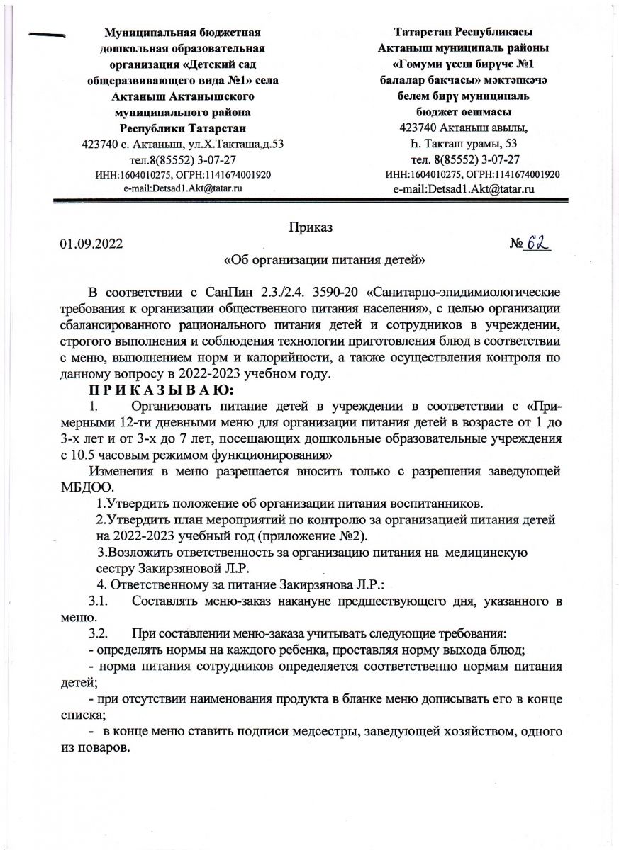 Приказ "Об организации питания детей" №62 от 01.09.2022 г.