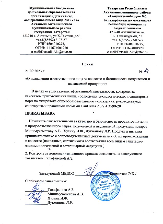 Приказ "О назначении ответственного за снятие и хранение суточных проб" №70 от 01.09.2023 г.