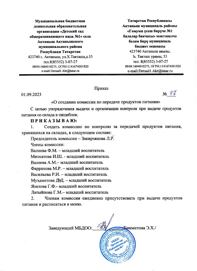 Приказ "О создании комиссии по передаче продуктов питания" №77 от 01.09.2023 г.