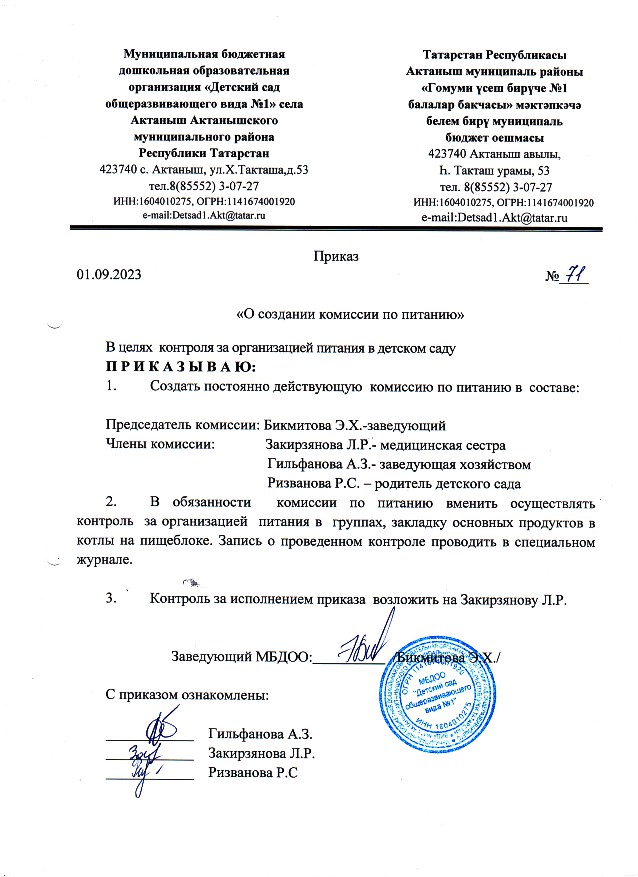 Приказ "О создании комиссии по питанию" №71 от 01.09.2023 г.