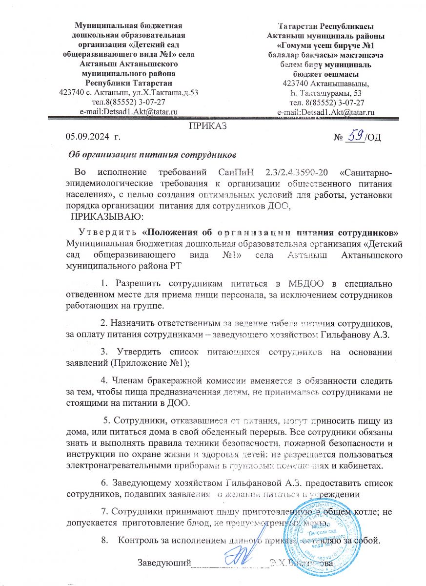 Приказ "Об организации питания сотрудников" №59 от 05.09.2024 г.
