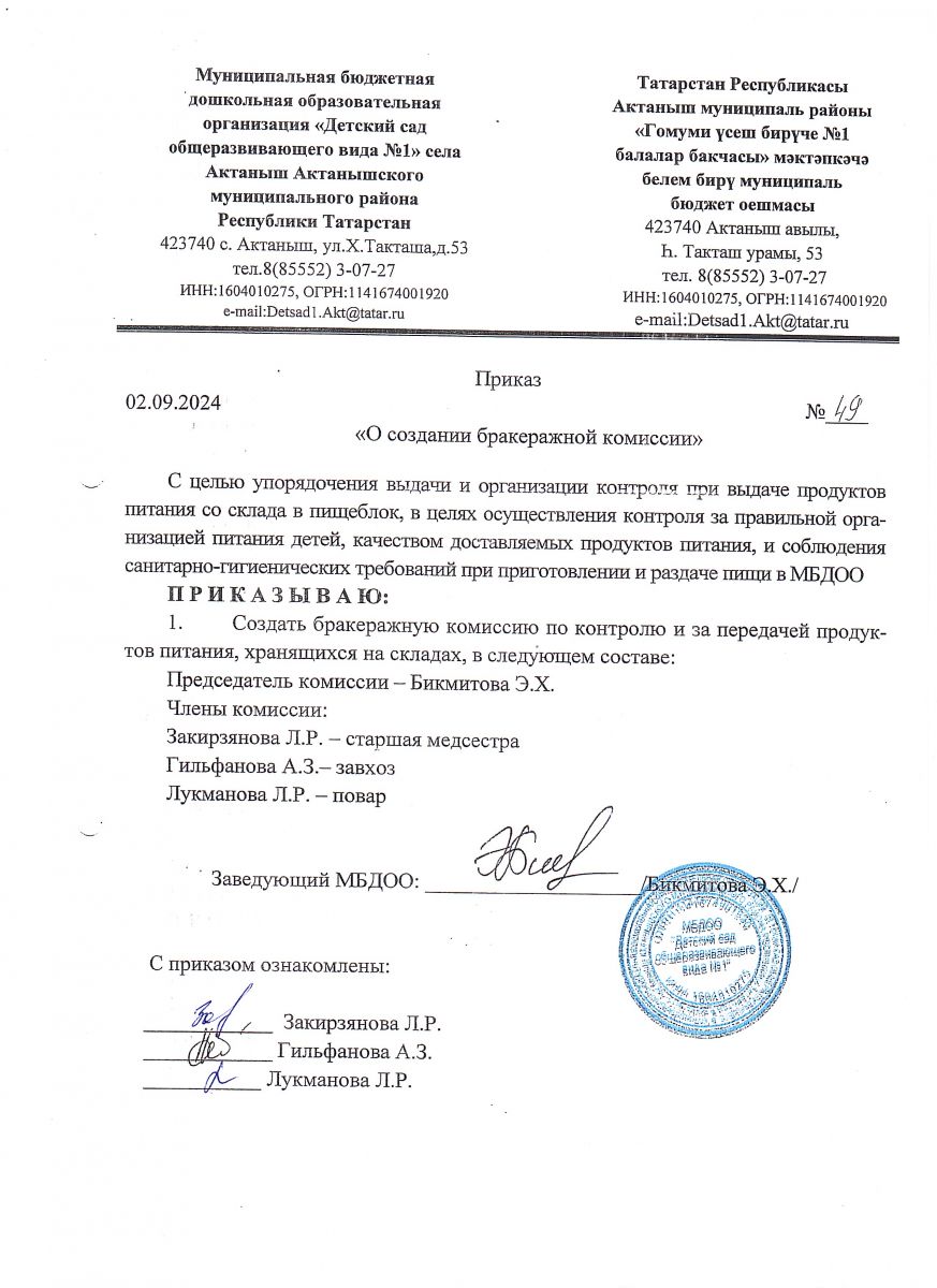 Приказ "О создании бракеражной комиссии" №49 от 02.09.2024 г.