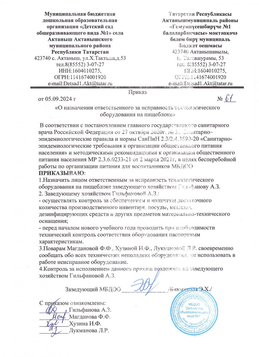 Приказ "Об организации питания детей" №48 от 02.09.2024 г.