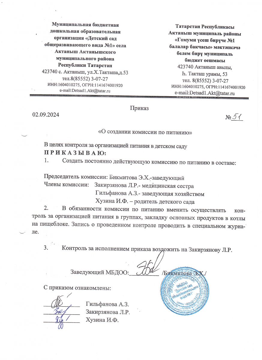 Приказ "О создании комиссии по питанию" №51 от 02.09.2024 г.