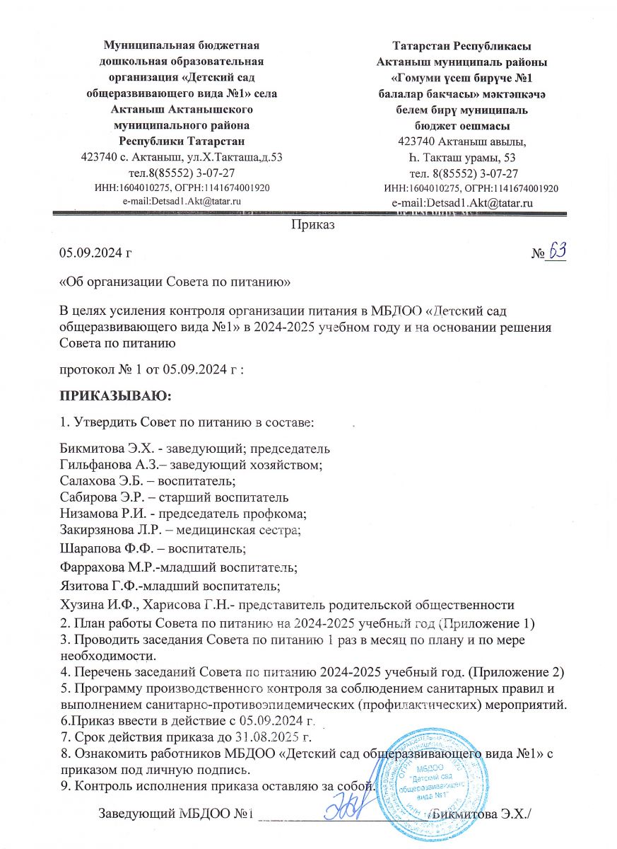 Приказ "Об организации Совета по питанию" №63 от 05.09.2024 г.