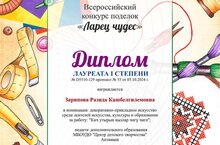 Педагог дополнительного образования Зарипова Резеда Кашбелгилемовна стала лауреатом I степени в номинации декоративно-прикладное искусство среди деятелей искусства, культуры и образования Всероссийского конкурса "Ларец чудес", представив работу "Кич утырып кызлар чигү чигә". Поздравляем!
