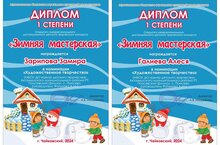 "Зимняя мастерская" ачык төбәкара балалар иҗат конкурсының "Художественное творчество" номинациясендә җиңүчеләребезне котлыйбыз - Зарипова Замира, Галиев Алеся. Җитәкчеләре: Фатыхова Әлфия Максалид кызы.