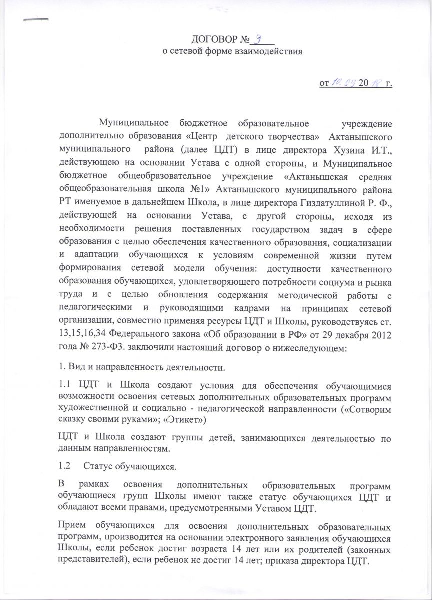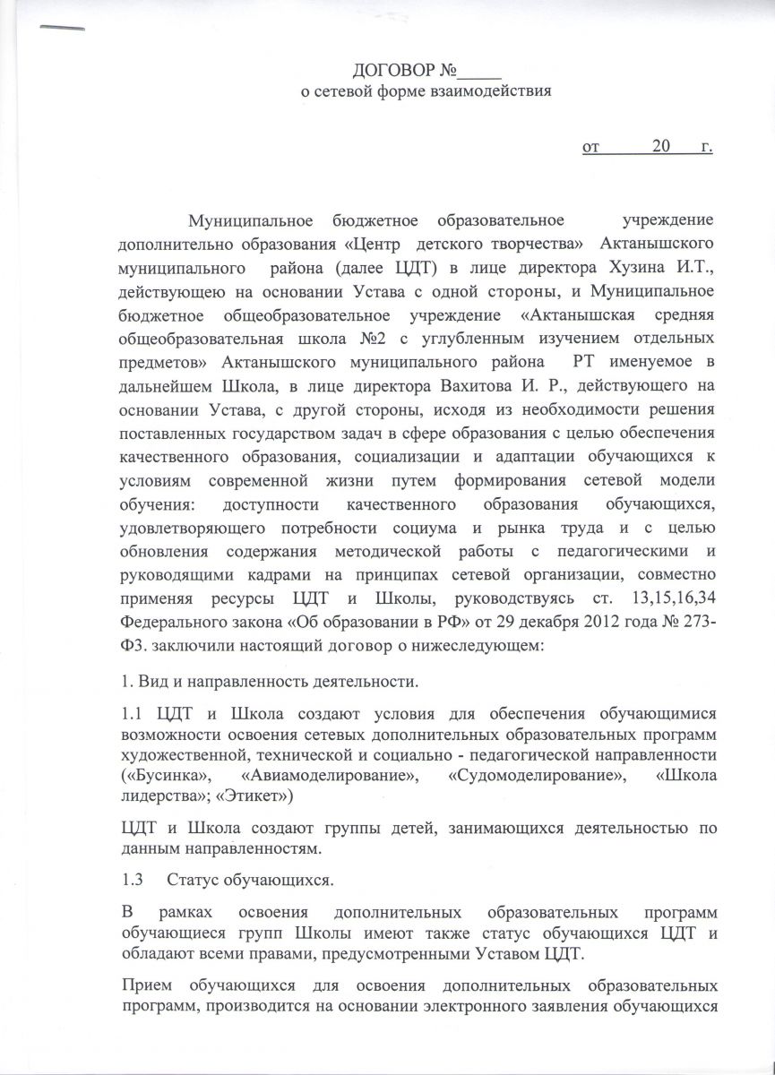 Договор о сетевой форме взаимодействия (АСОШ № 1):