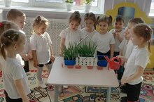 Кечкенәләр төркеме балалары тәрәз төбе бакчасында күзәтүне һәм су сибеп хезмәт куюны бик теләп башкаралар.\\Дети младшей группы с удовольствием выполняют работу по наблюдению и поливу в оконном саду.