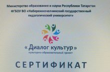 "Диалог культур"\\"Диалог культур" 30.01.2021 Яр Чаллы дәүләт педагогия университеты оештырган "Диалог культур" проектында бакчабыздан педагог Оксана Имамова катнашып сертификатка ия булды.\\В проекте "Диалог культур", организованном Набережночелнинским государственным педагогическим университетом, приняла участие педагог Оксана Имамова.