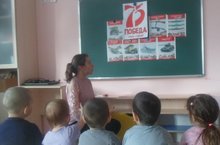 ӨЙДӘ УТЫР::Бөек Җиңүгә 75 ел уңаеннан балалар белән бик күп чаралар үткәрелә. Рәсем ясау, шигырьләр өйрәнеп бәйгеләрдә катнашу-педагоглар һәм ата-аналарның бердәм эшчәнлеген чагылдыра.\\ СИДИДОМА: К 75 летию Великой Победы с детьми проводится различные мероприятия.
