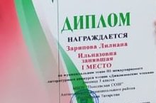 Ученица 3 класса Лилиана Зарипова в муниципальном этапе Международного литературного конкурса "Джалиловские чтения" заняла 1 место. Молодец, Лилиана! Желаем дальнейших успехов и побед! Руководитель: Айзира Хабиповна Акмалова.