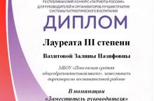 Поздравляем!!! Залина Назифовна Вахитова заместитель директора по воспитательной работе награждается дипломом лауреата 3 степени в республиканском конкурсе "Патриоты России" в номинации "Заместитель руководителя". Желаем дальнейших успехов в работе!