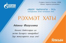 9 класс укучысы Айзилә Фәйзуллина ГАЗПРОМ ТРАНСГАЗ оешмасы "Ялкын" журналы белән берлектә уздырган "Яшәү чыганагы - газ" бәйгесендә актив катнашканы өчен Рәхмәт хаты белән бүләкләнә. Афәрин, Айзилә! Җитәкчесе: Шарипова Гөлшат Әхмәтшәех кызы.