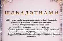 Поздравляем! Учитель татарского языка и литературы Гульназ Кашафовна Муллагалиева получила свидетельство об участие панель дискуссии на региональной научно-практической конференции "21 нче гасыр проблемалары яссылыгында Гаяз Исхакый"