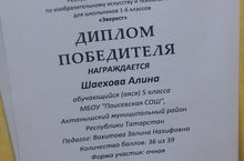 Поздравляем! Ученица 5 класса Алина Шаехова стала Победителем на республиканской олимпиаде по изобразительному искусству и технологии для школьников 1 - 6 классов "Эверест" и награждается дипломом. Она из 39 баллов набрала 36 балл. Руководитель: Залина Назифовна Вахитова. Молодцы! Так держать!