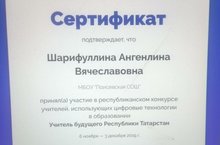 Поздравляем! Ангелина Вячеславовна учитель русского языка и литературы получает сертификат о подтверждении участия в республиканском конкурсе учителей, использующих цифровые технологии в образовании - Учитель будущего Республики Татарстан! Молодец!!!