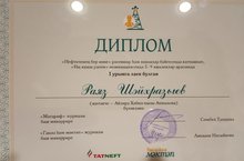 Котлыйбыз!!! "Нефтьченең бер көне" рәсемнәр һәи хикәяләр бәйгесендә катнашып, "Иң яхшы рәсем" номинациясендә 5-9 яшьлекләр арасында 2 нче сыйныф укучысы Раяз Шәйхразыев 1 урын яулап ДИПЛОМ һәм истәлекле бүләк белән бүләкләнде. Җитәкчесе: Айзирә Хәбип кызы Акмалова.