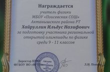 Поздравляем! Благодарственное письмо награждается учитель физики Хайруллин Ильдус Назифович за подготовку участника региональной открытой олимпиады по физике среди 9-11 классов.