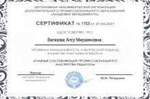 Алсу Мирзаяновна Вагизова учитель биологии и химии получила сертификат за проявленную инициативность и творческий подход в качестве участника конкурса "Главное составляющие профессионального мастерства педагога".