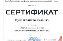 Гульназ Кашафовна Муллагалиева учитель родного языка и литературы получила сертификат за участие в Республиканском конкурсе "Лучший персональный сайт и блог 2021".