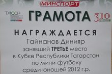 Ученик 3 класса Гайнанов Динияр занял 3 место в Кубке Республики Татарстан по мини-футболу среди юношей 2012 года рождения и награждается грамотой. Молодец, Динияр!