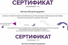 Ученик 8 класса Вагизов Айнур и ученица 5 класса Вагизова Эльвира успешно освоив дистанционную профильную программу "Экология растении" в объеме 28 часов награждаются сертификатами. Руководитель: Алсу Мирзаяновна Вагизова.