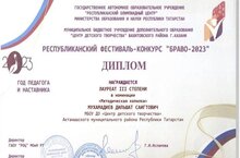 Республиканский фестиваль-конкурс, посвященный Году педагогов и наставников, «Браво - 2023» прошел с октября 2022 года по март 2023 года. Конкурс организован ГАОУ «Республиканский олимпиадный центр» МО и Н РТ, МБУДО «Центр детского творчества» Вахитовского района г. Казани. Цель фестиваля-конкурса - содействие развитию творческих способностей детей и подростков; формирование гражданских и нравственных ориентиров, уважительного отношения к профессии - Учитель. Педагоги дополнительного образования Мухамадиев Д.С., Хасанова Н.Н. стали победителями фестиваля-конкурса в номинации “Методическая копилка”. Работа воспитанника кружка «Оригами» в номинации «Для Вас, учителя!» оценена Дипломом победителя. Руководитель кружка – Султанова Ф.М.